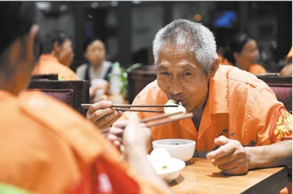 “謝謝你們!”接過工作人員遞過來的餐盤,環(huán)衛(wèi)工人張守菊順口說。“謝謝你們才是,你們辛苦了!”店長王水英遞上餐盤,微笑著回應(yīng)。